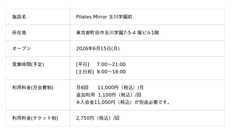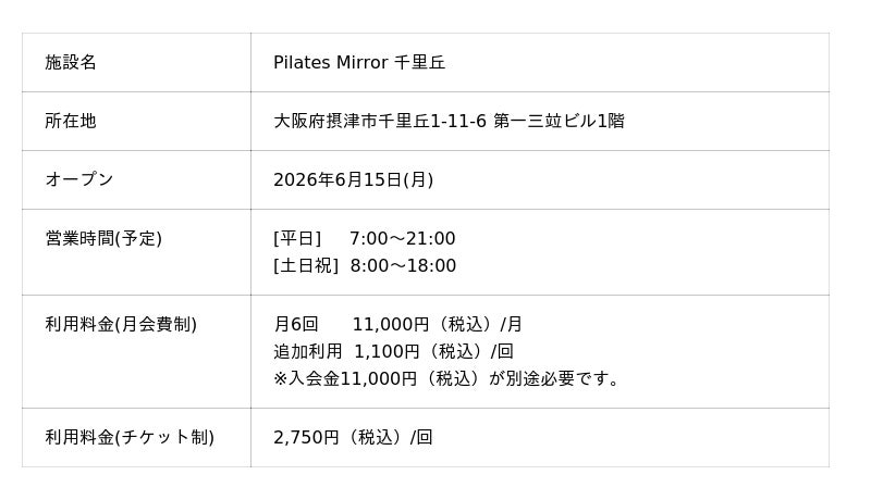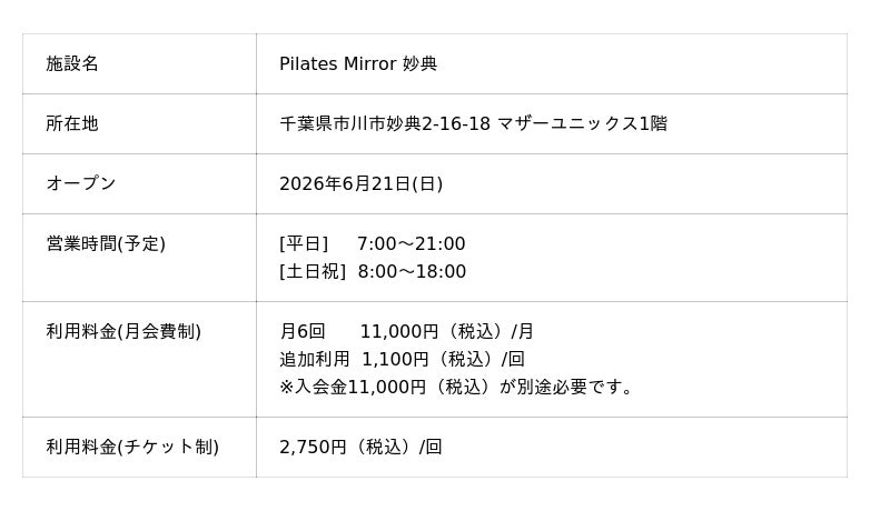 コナミスポーツ株式会社(以下、「弊社」)は、天井にミラーを設置したマシンピラティススタジオ「Pilates Mirror 玉川学園前(東京都町田市)」と「Pilates Mirror 千里丘(大阪府摂津市)」を2026年6月15日(月)に、「Pilates Mirror 妙典(千葉県市川市)」を2026年6月21日(日)にオープンします。