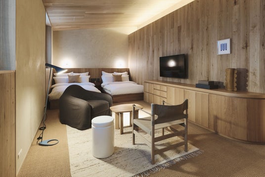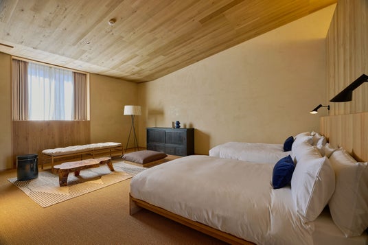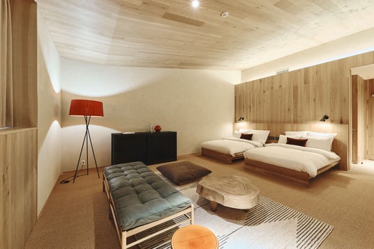 山小屋をイメージした全9室の小さなホテルの館内には、名作家具が配されるとともに、随所にアーティストの作品がちりばめられ、空間そのものが静かなギャラリーのように広がります。木のぬくもりや光、香り、音に包まれながら、五感を通して心身がゆっくりとほどけていくような滞在をお楽しみいただけます。