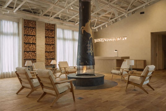 ロビー入ってすぐ目に飛び込んでくる煙突のアートを手掛けたのは、軽井沢と東京で活動されている画家の平澤まりこ氏。「軽井沢の自然からの祝福と調和」をテーマに、暖炉の炎が立ち昇っていくように、この地に息づく動物たちがともに螺旋を描き、軽やかに駆け上っていく情景を表現しています。焚火のやさしい音が、訪れる方を静かにお迎えいたします。