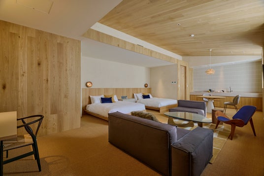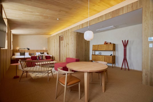 キッチンとダイニングを備えた室内には、包容力のあるモジュラーソファを中心に据え、ワーキングや長期滞在にも応える家具を配しました。構造美と用の美が穏やかに溶け合うなか、イサム・ノグチのコーヒーテーブルやシェーカーチェア、ベンチ、ウェグナーのCH24、CH07が、やわらかな造形の対話を紡ぎます。北側から差し込む自然光がそれぞれの質感を静かに際立たせ、滞在のひとつひとつの所作を豊かな時間へと昇華させます。