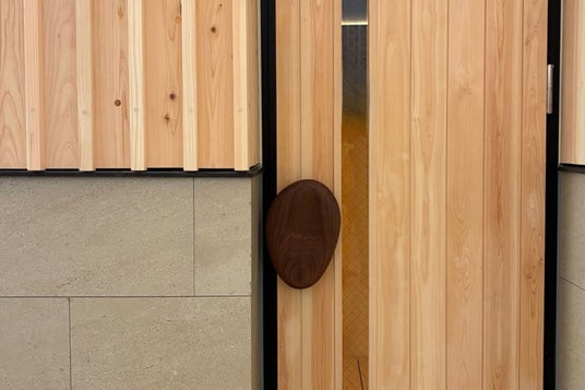木工作家・盛永省治氏によって制作されたサウナ室の大きな扉の取手は、力強い佇まいの中に木の温もりを宿し、思わず手を添えたくなるような滑らかな曲線が印象的です。空間に静かな存在感を与えながら、使うたびに手に馴染む心地よさをもたらし、サウナへと向かうひとときを穏やかに導きます。