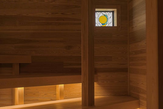 薄暗いサウナの室内に、静かに差し込むやわらかな光。小窓を彩るステンドグラスは、鹿児島を拠点に活動する作家・西田麗美氏の作品です。軽井沢の風景をイメージし、浅間山や森に息づく動物たち、霧、そして太陽のモチーフが織り重なるように表現されています。