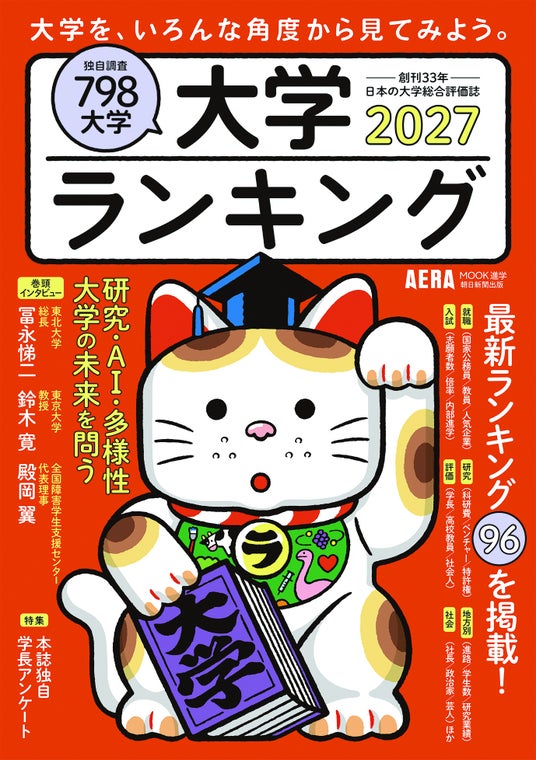 朝日新聞出版は、『大学ランキング2027』を2026年4月20日(月)に発売します。偏差値だけでなく、「大学を、いろんな角度から見てみよう」をコンセプトに、編集部が調査・収集したデータ・ランキングを一挙に公開! ランキングの項目は、就職、資格、入試、研究などのテーマのほか、高校や企業からの評価、政治家や社長、俳優やスポーツ選手の出身、ドラマ・映画のロケ地まで全96テーマ。さまざまな切り口から日本の大学の特色が見えてくる一冊です。
