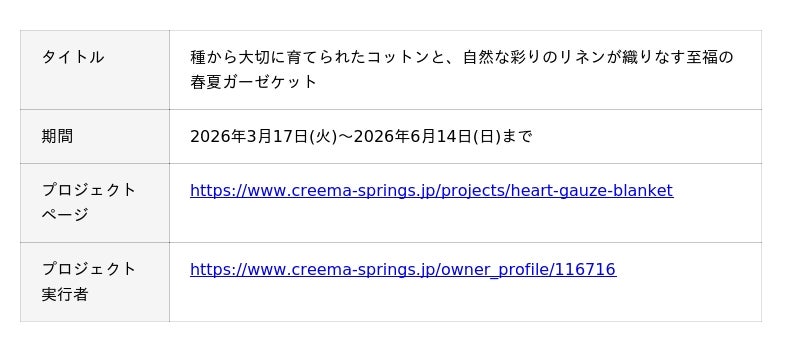 何よりも「安全・安心」な製品づくりにこだわり、オーガニック繊維製品を自社で企画・製造・販売している株式会社ハート(高知県高知市 代表取締役 山岡弘章)は、持続可能な社会を目指す活動の一環として、農薬・化学肥料を用いる従来農法からオーガニック農法へ移行するまでの3年間に栽培された「コットン・イン・コンバージョン」の糸を使用した春夏ガーゼケット、『コットンリネンの彩りガーゼケット』(4色展開)を、3月17日(火)より、クラウドファンディングサイト「Creema SPRINGS(クリーマスプリングス)」にて公開しました。