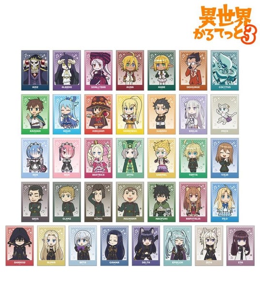 アインズ、アルべド、シャルティア、アウラ、マーレ、デミウルゴス、コキュートス、カズマ、アクア、めぐみん、ダクネス、スバル、エミリア、パック、レム、ラム、ベアトリス、オットー、ガーフィール、ターニャ、ヴィーシャ、ヴァイス、グランツ、ケーニッヒ、ノイマン、岩谷尚文、ラフタリア、フィーロ、シャドウ、アルファ、ベータ、ガンマ、デルタ、イプシロン、ゼータ、イータのイラストをブロマイドに仕上げました。