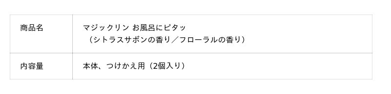 そこでこのたび、浴室のカビやピンクぬめりを約6週間生えにくくする*²*³*⁴『マジックリン お風呂にピタッ』を発売いたします。1971年の誕生以降、長きにわたり生活者のくらしに寄り添ってきた「マジックリン」ブランドから、新たに提案する浴室用カビ抑制・消臭剤です。本体ケース裏面の磁石により、浴室の壁に貼り付けて*⁵使用できる手軽さが特長です。直接平らな場所に置いたり、フックに引っ掛けたりすることもできるなどくらしになじみやすく、浴室のスタイルに合わせて自由自在にご使用いただけます。