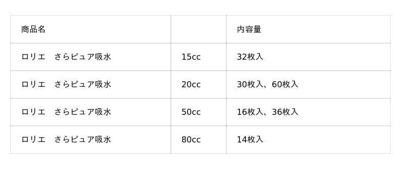 そこで、このたびの改良では、「ロリエ さらピュア吸水」の特長である、パワフル吸水、ニオイを瞬時に閉じ込める瞬間消臭、肌にやさしいやわらかエアリータッチはそのままに、接着力を向上*1。これにより、動いてもショーツとのズレを防ぎ、剥がれやすさを軽減。より快適なつけ心地を実現しました。ラインアップは、15cc、20cc、50cc、80ccの4つから吸収量に合わせてお選びいただけます。