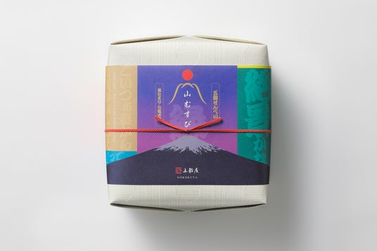 見られる明快な色とかたちへと落とし込み、その世界観に調和する「しるし」としてデザインしました。山むすびの意味合いを大切に残しながら図形的に整理し、「紋」を思わせる意匠に仕立てています。掛け紙には、歌舞伎の代表的な名台詞をタイポグラフィとして表現し、日本の文字が持つ力強さと美しさを視覚的に伝えます。