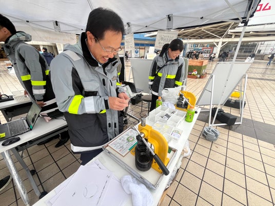 缶バッジを作るJR社員さん(2025年10月開催のわんわんハロウィンの写真)