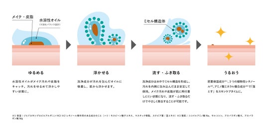 可溶化バランスに着目した水溶性オイルが、メイク汚れや皮脂を素早くなじませて浮かせやすくし、洗浄成分が汚れを包み込むように作用。その後、汚れを取り込んだ洗浄成分が安定したミセル構造を形成し、肌からやさしく引き離します。必要なうるおいを守りながら、不要な汚れだけを効率的にオフする洗浄メカニズムです。