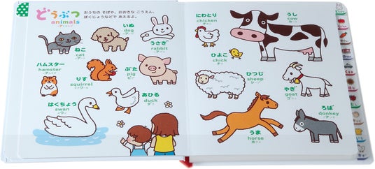 『0さい~4さい こどもずかん英語つき』は、動物、食べ物、乗り物など、こどもが興味を持ちやすいテーマごとに、絵と日本語・英語の言葉を掲載した人気絵本です。