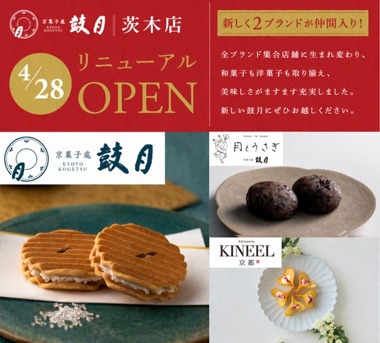 株式会社鼓月(本社:京都市、代表取締役社長:中西英貴)が運営する京菓子處 鼓月 茨木店は、2026年4月28日に和生菓子ブランド「月とうさぎ」と洋菓子ブランド「Patisserie KINEEL京都」を新設し、リニューアルオープンいたします。