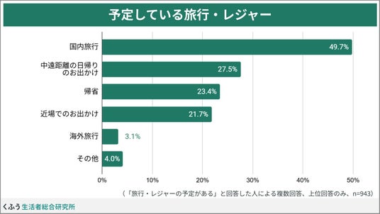 予定している旅行・レジャーは「国内旅行」が約半数(49.7%)。「中距離の日帰りのお出かけ」(27.5%)、「帰省」(23.4%)、「近場でのお出かけ」(21.7%)が続きました。