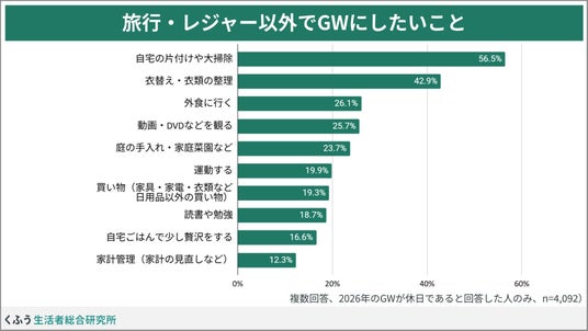 旅行・レジャー以外で、今年のゴールデンウィークにすること・したいことをたずねたところ、最も多かったのは「自宅の片付けや大掃除」(56.5%)、次に「衣替え・衣類の整理」(42.9%)と、家事が続きました。