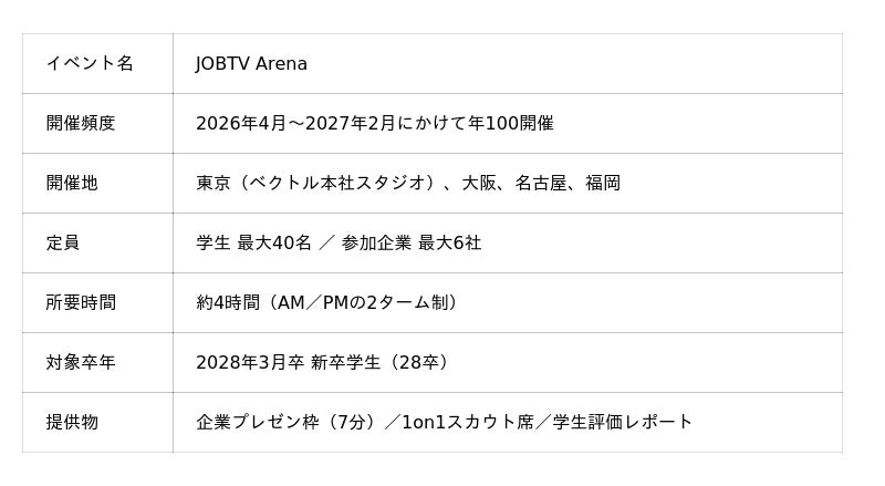 株式会社ベクトル(本社:東京都港区、代表取締役社長CEO:西江 肇司、東証プライム:6058)内で、動画採用プラットフォーム「JOBTV」(https://media.jobtv.jp)を運営するJOBTV事業本部は、SNS時代の購買行動モデル「SEESAS(シーサス)」に基づくSNS×動画メディア×対面型イベントを統合した“集客エコシステム”の最終フェーズ【Action】を担う対面型イベント『JOBTV Arena』を、28卒採用市場向けに本格展開いたします。