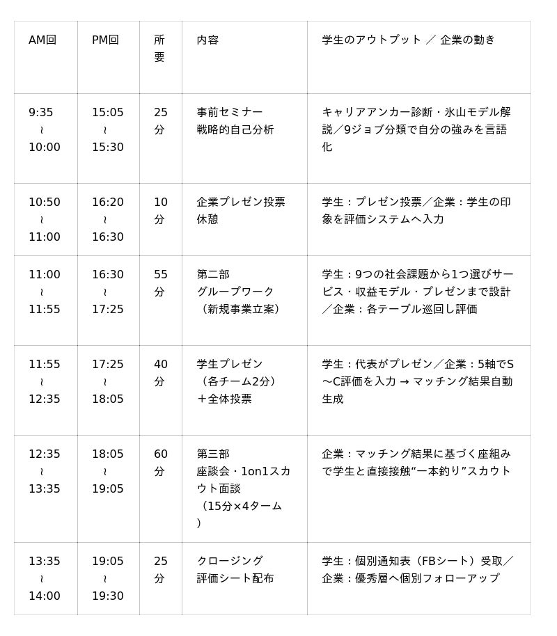 3.意思決定設計:企業は評価スコアと当日の接点をもとに学生を選定し、1on1の個別面談を実施。志向性や意欲を見極め、選考フローへスムーズに接続できます。