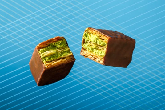 2種のミルフィユ(あまおう苺、八女抹茶)が入ったアソート。ミルフィユ(八女抹茶)は、福岡県産八女抹茶で仕立てたクリームを、ニュージーランド産パイでサンド。幾重にも折り重ねた1944層のパイは、軽やかにほどけるサクサク食感。仕上げにミルクチョコレートを纏わせました。織り重なる層とともに広がる、八女抹茶のほろ苦さとやさしい甘みが調和する、奥行きのある味わいに仕上げました。