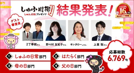 今回は、過去最多となる6,769句(前年比1.5倍)の応募が集まり、1次審査では「しゅふ川柳2026」選考委員会がノミネート作品60句を選出。2次審査では、過去最多50,143票(前年比1.7倍)の一般投票と、「しゅふJOB」掲載企業による投票を実施しました。最終審査では、ゲスト審査員の野々村 友紀子氏、2丁拳銃、キンタロー。氏をはじめとする著名人と、主催のビースタイルメディア代表 石橋によって、受賞作品を選出しました。以下に受賞結果をご報告するとともに、川柳をご応募いただいた皆さま、一般投票にご参加いただいた皆さまへ、心より御礼申し上げます。