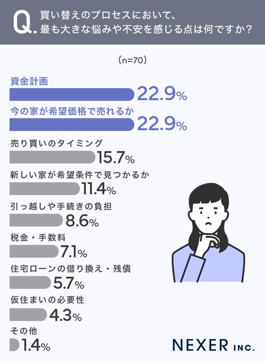 買い替えに伴う資金面の不安や住宅価格の高騰、さらにタイミングの難しさなど、複雑な悩みが寄せられています。特に「資金計画」と「売却価格」が同率1位になったことは、買い替えにおける資金面の見通しがいかに重要であるかがわかります。