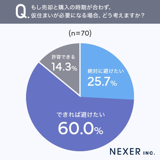 結果「できれば避けたい」が60.0%で最も多く、「絶対に避けたい」の25.7%と合わせると、85.7%の方が仮住まいに対して否定的な姿勢を示しました。「許容できる」と答えた方は14.3%にとどまっています。