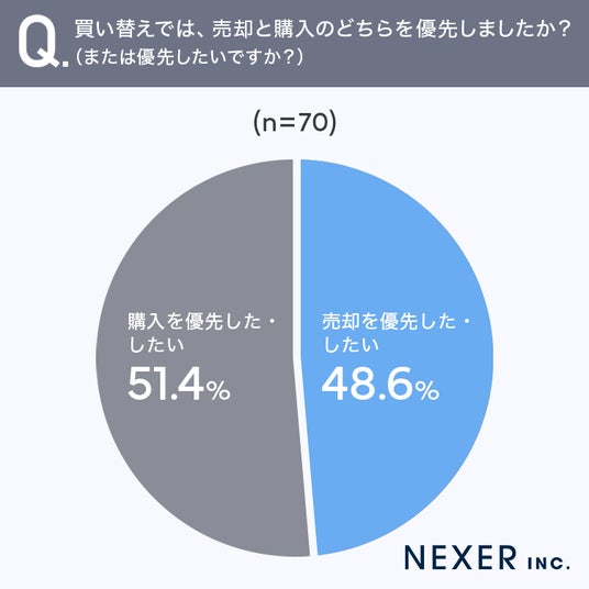 結果「購入を優先した・したい」が51.4%、「売却を優先した・したい」が48.6%となり、ほぼ半々に分かれる結果となりました。