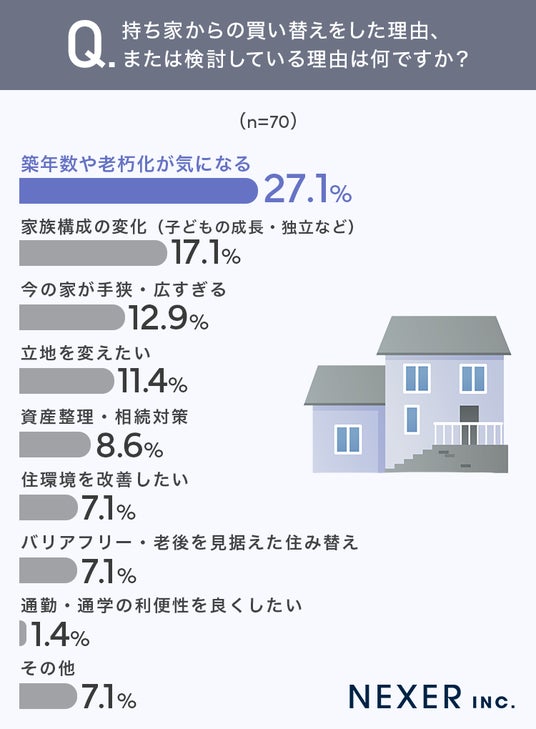 結果「築年数や老朽化が気になる」が27.1%で最も多く、次いで「家族構成の変化(子どもの成長・独立など)」が17.1%、「今の家が手狭・広すぎる」が12.9%と続きました。