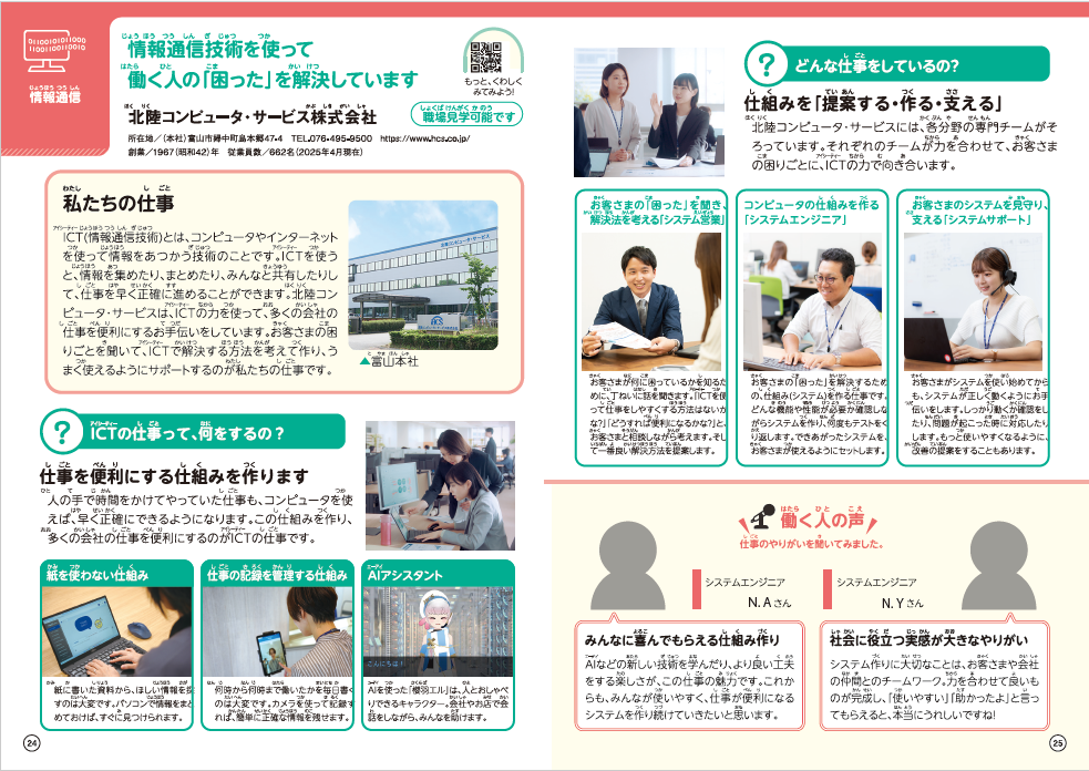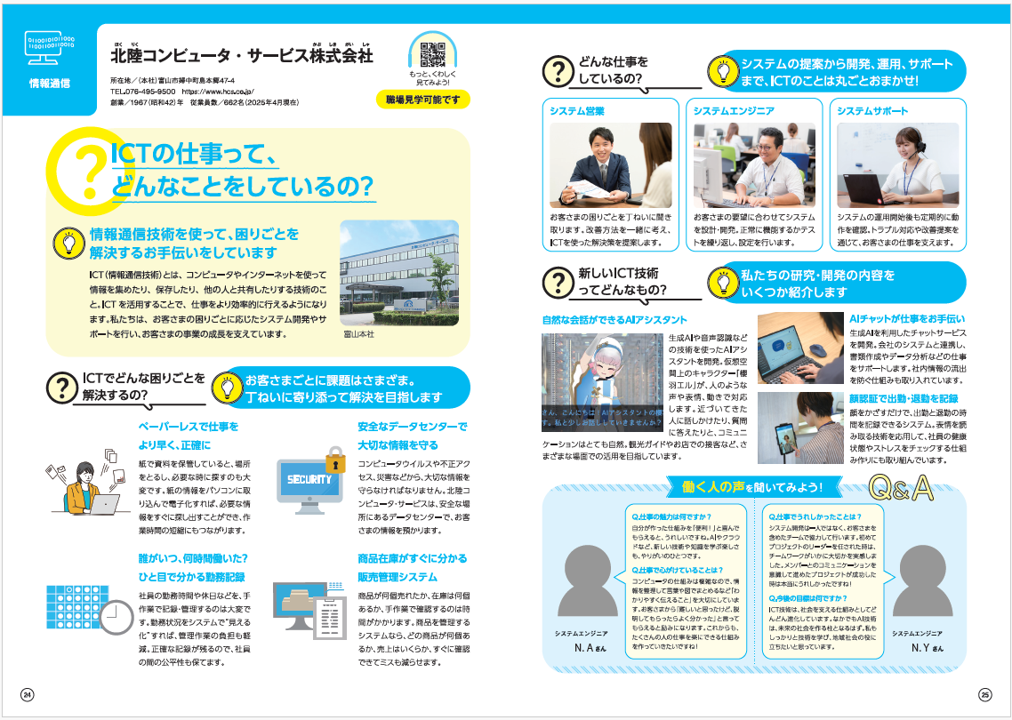 「お仕事ノート(小学生用)」「お仕事ブック(中学生用)」は文部科学省が推進するキャリア教育の副教材として、教育委員会の支援を得て、株式会社中広が発行し、市区町村単位で配布されています。地域企業の仕事が具体的に紹介されており、子供たちが将来の夢を描くきっかけを提供しています。弊社はこの趣旨に賛同し、富山市2026年度版に協賛しました。弊社の紹介ページでは、ICTの力を用いて課題を解決する仕組みを具体的な事例とともに紹介しています。今後も地域と社会の持続的な発展に寄与する活動を継続してまいります。