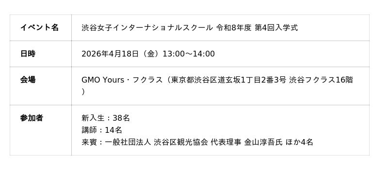 英会話・動画制作・SNS運用といった次世代スキルを学ぶ「渋谷女子インターナショナルスクール(以下、本校)」は、2026年4月18日(土)にGMO Yours・フクラス(東京都渋谷区)にて、令和8年度 第4回入学式を挙行し、38名の新入生を迎え入れましたことをお知らせいたします。