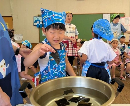 にじいろクッキングは、「みそ汁の作れる5歳児」をテーマに、かつお節と昆布で出汁をとることから始まり、とった出汁の試飲や、給食を調理する