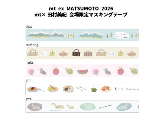 mtイベントでは、開催地域や会場にちなんだデザインのマスキングテープを期間限定で販売しています。今回は、信州の方言やアルプスの山々をモチーフにした会場限定テープが登場。さらに、長野県在住のちぎり絵作家・田村美紀が描く、長野をテーマにしたデザインも会場限定で販売します。来場記念にぜひお手に取ってご覧ください。