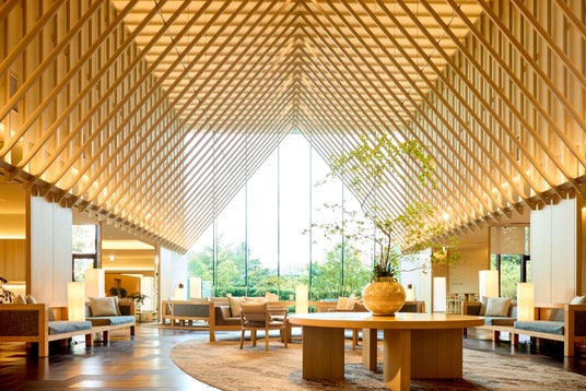 グランピングをイメージした、天井高のある和モダンのロビー
