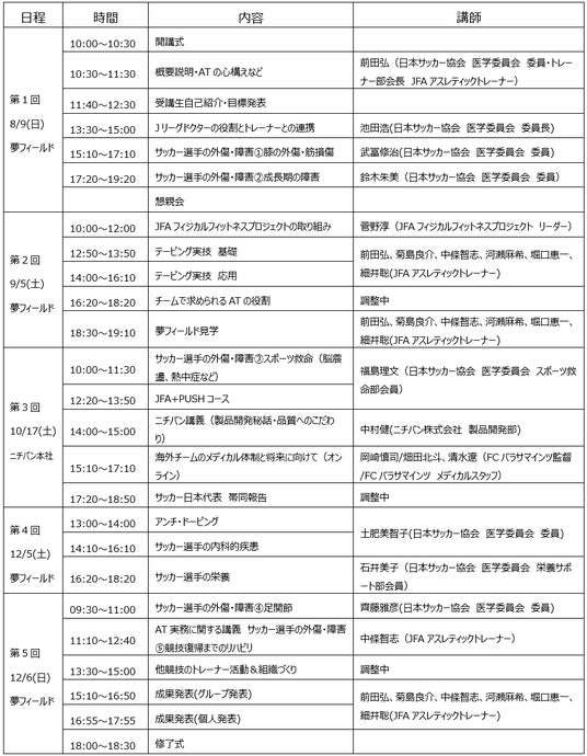 サッカーに関わるアスレティックトレーナーを志す方を対象に、JFAの活動に関わるドクターやアスレティックトレーナーからのセミナー機会を提供し、サッカーの現場における怪我予防、応急処置、コンディショニング等の業務に触れる機会を提供する。