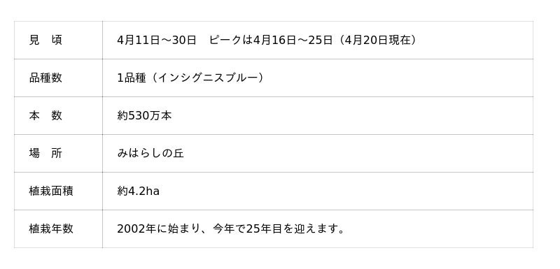ネモフィラの満開は4月25日頃まで続き、4月いっぱいは比較的花数の多い状態が続く見込みです。