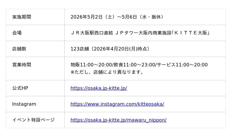 日本郵政不動産株式会社(東京都千代田区、代表取締役社長 池田 明)およびJPビルマネジメント株式会社(東京都千代田区、代表取締役社長 三宅 正博)が運営する「KITTE大阪」(大阪府大阪市北区梅田3丁目2番2号) は、2026年5月2日(土)~5月6日(水・振休)までの期間、ゴールデンウィークイベント「廻るにっぽん」を開催します。また、5月1日(金)~10日(日)は母の日期間とし、おすすめギフトの販売やプチフラワーブーケのプレゼントなどを行います。