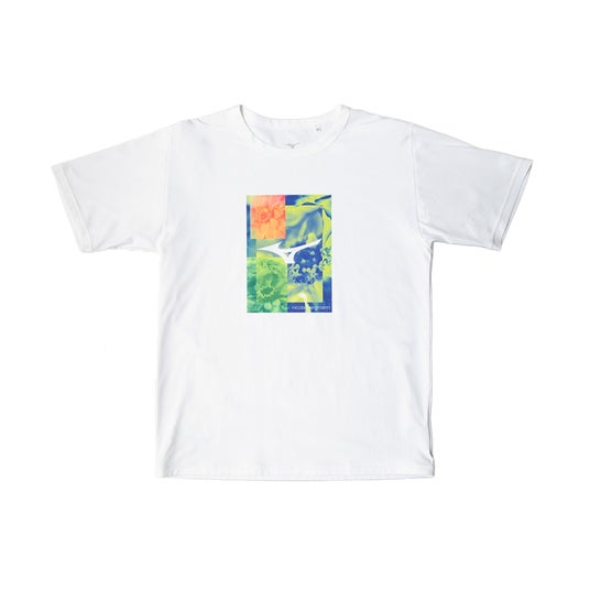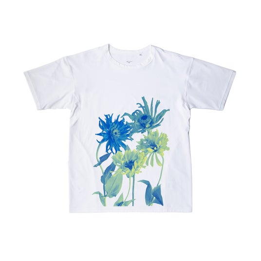 花が次々と咲き誇り、長い間美しく咲くジニアと、歴史あるミズノをリンクさせたフラワーデザインをフロントにプリントした、爽やかで印象的なTシャツ。