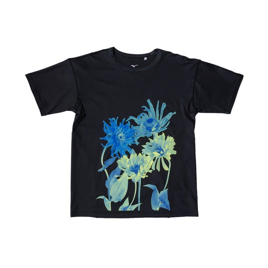 一面に敷き詰めたジニアの鮮やかな色彩に、躍動的なブラーを施し、ウエア全体で花々のカラーグラデーションを表現したシアーTシャツ。