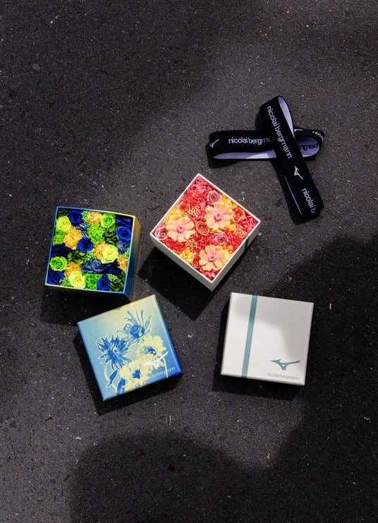 また、フラワーボックスをご購入のお客様の中から数量限定で、ニコライ バーグマンとミズノのダブルロゴバンドをプレゼントいたします。ぜひ、アパレルアイテムと共にお楽しみください。