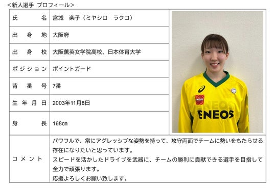 ENEOSサンフラワーズは、1名の新人選手を迎えて2026-2027シーズンに臨みますことを、お知らせいたします。