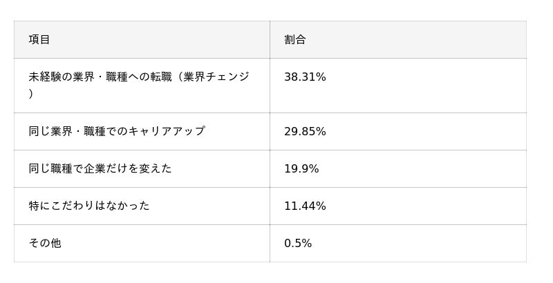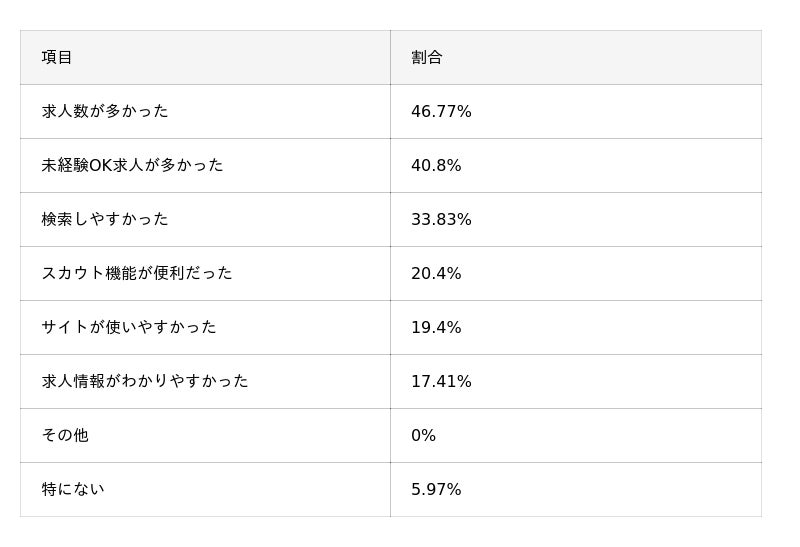 - 満足度は「満足以上」が75.1%と高水準で、理由は「求人数の多さ」(46.8%)や「未経験OK求人の多さ」(40.8%)が中心。一方で、「求人の質のばらつき」(28.4%)やブラック企業混在(21.4%)などへの不満も見られ、情報精査の重要性が示された。