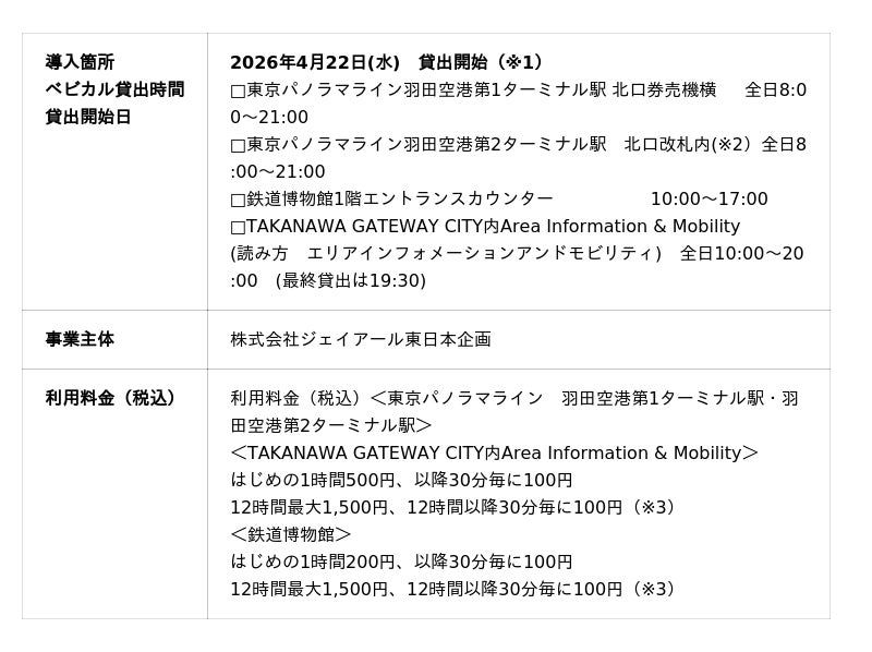 ~4月22日より 羽田空港第1ターミナル駅・第2ターミナル駅、鉄道博物館 TAKANAWA GATEWAY CITY内Area Information & Mobilityの4箇所でサービス開始~