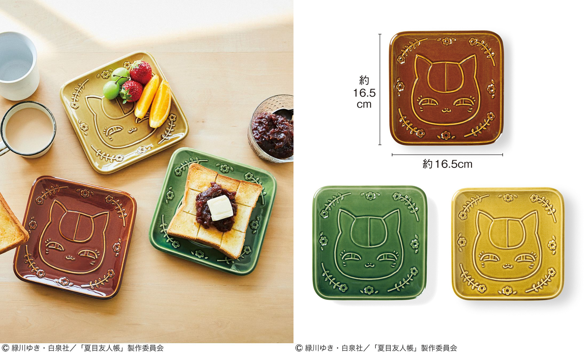 にっこり微笑むニャンコ先生のお顔とお花のレリーフがあしらわれた瀬戸焼のトースト皿です。職人がひとつひとつ塗布した釉薬は食卓にもよく映えるカラーで、デザインは〈イエロー〉〈ブラウン〉〈グリーン〉の3種類。トーストにぴったりなサイズ感もかわいくて◎です。電子レンジや食洗機にも対応しています。