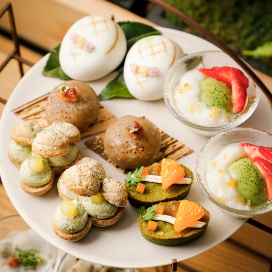 スイーツやセイボリーにも一保堂茶舖の抹茶を使用し、甘酒と合わせたヴェリーヌ、柑橘と合わせたタルトレット、サーモントラウト マリネと抹茶の包み、抹茶とホワイトチョコのスコーンなど、さまざまな味わいで抹茶の新たな美味しさを発見していただけます。また、抹茶だけではなく、ほうじ茶クリーム大福や煎茶のダックワーズなど、さまざまなお茶を通じて、和の心を再発見できるようなアフタヌーンティーです。