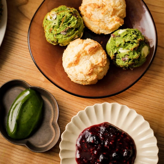 抹茶と柑橘のタルトレット / 抹茶と甘酒のヴェリーヌ / ほうじ茶クリーム大福 / 煎茶のダックワーズ / 季節の生菓子 / サーモントラウト マリネと抹茶の包み / 甘夏米粉ベーグル / 酵素玄米と桜エビのアランチーニ / 茶殻の佃煮寿司 / 白みそスコーン / 抹茶とホワイトチョコのスコーン / ブルーベリー木苺ジャム / 甘酒クリーム