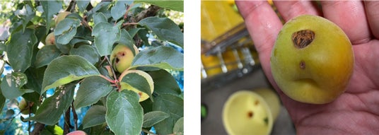 ひょうがあたる上側の梅には痛々しい傷がみえる ひょうに当たった部分がかさぶたのようになっている