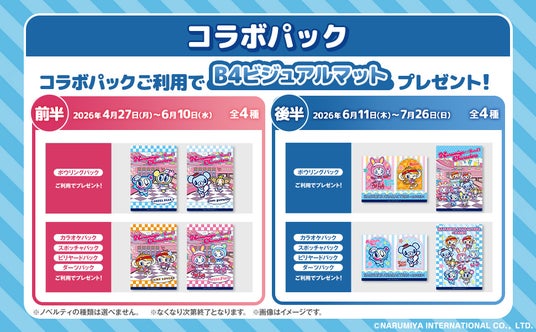 全国のボウリング97店舗、カラオケ92店舗、スポッチャ54店舗、ビリヤード46店舗、ダーツ74店舗でコラボパックを販売いたします。各店舗で販売するコラボパックで施設を利用いただいたお客様にはコラボパック限定ノベルティと、期間限定で「ナルミヤキャラクターズ」特別フォトフレームが登場するラウンドワンオリジナルプリント機「Rism」の専用コインをプレゼントいたします。