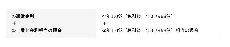 参加条件を満たしたお客さまに、金利年1.0%(税引前)の通常金利に加え、上乗せ金利年1.0%(税引前)相当の現金をプレゼントいたします。