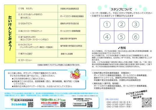 また、昭和54年から青少年野外活動の一環として年に1回(5月5日)に実施しており、徳島市のこどもの日の行事として定着しております。