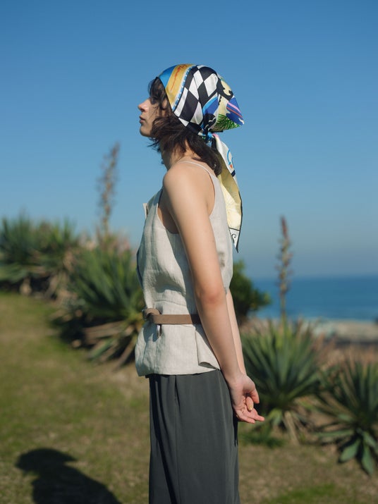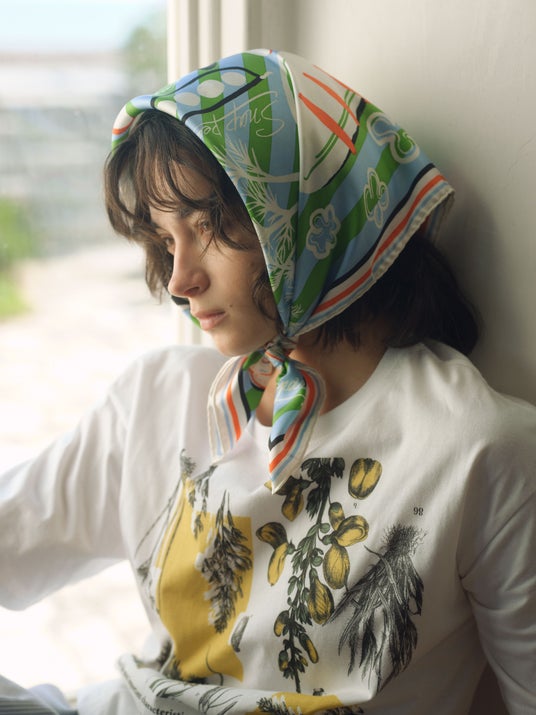 〈シルクスカーフ65〉ベジ シルク100% ¥16,500〈半袖S Tシャツ〉ボタニカル コットン100% ¥9,900 (全て税込)