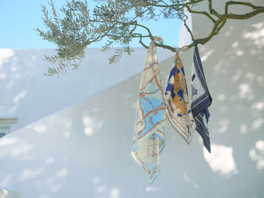 左から〈シルクスカーフ88〉ビットバルーン ¥22,000 〈シルクスカーフ65〉ピルエット ¥16,500 〈シルクスカーフ65〉バルーンバンダナ ¥16,500 全てシルク100% (全て税込)