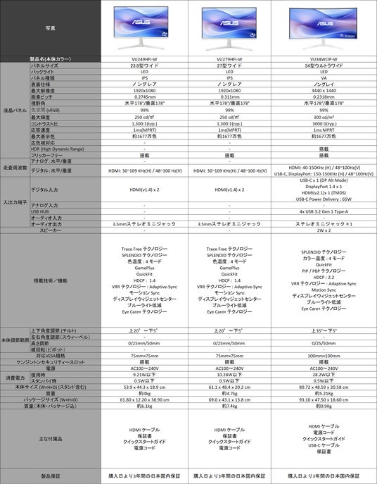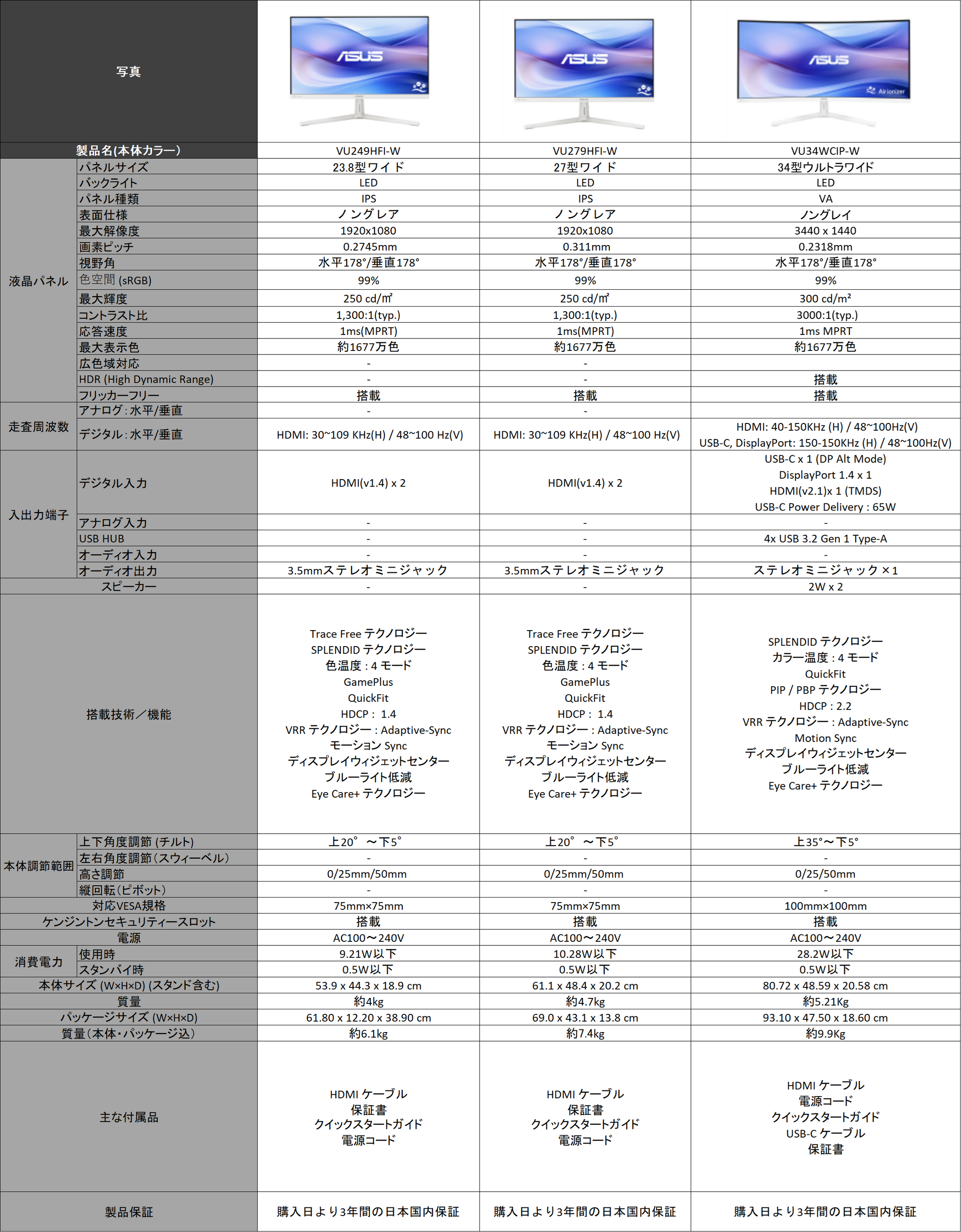 さまざまなデスク環境や用途に合わせてお選びいただけるよう、23.8型、27型、34型ウルトラワイドの3モデルを展開しています。